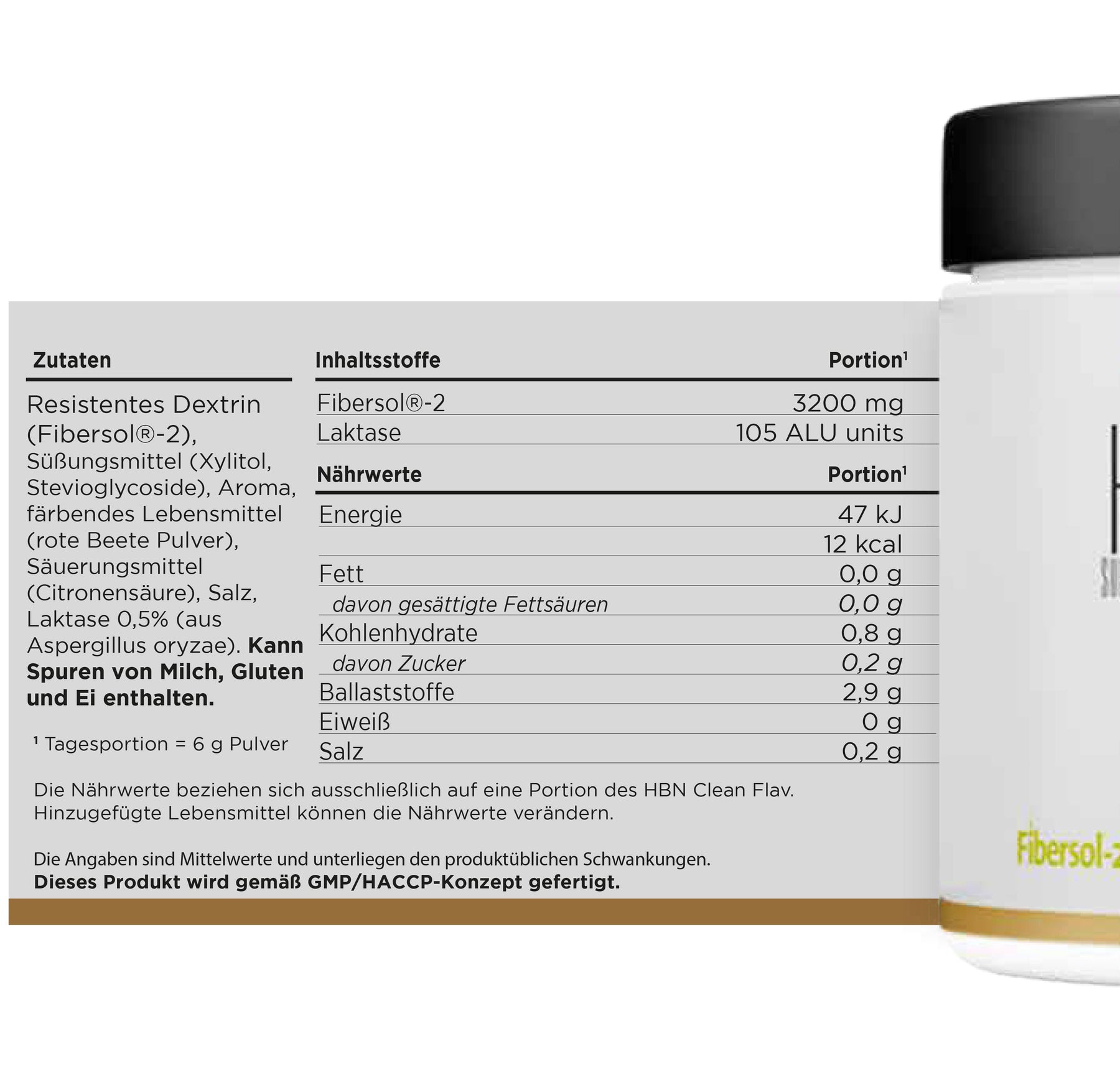 Auf Inulin verzichten wir nicht, weil wir denken, Inulin wäre grundsätzlich eine schlechte Substanz. Leider ist es aber so, dass nicht wenige Menschen schon auf relativ kleine Mengen Inulin mit Verdauungsbeschwerden reagieren. Um dieser unschönen Nebenwirkung aus dem Weg zu gehen, setzen wir auf den Ballaststoff FIBERSOL-2. Dieser verspricht eine durchweg gute Verträglichkeit auch mit Verabreichung höherer Mengen.